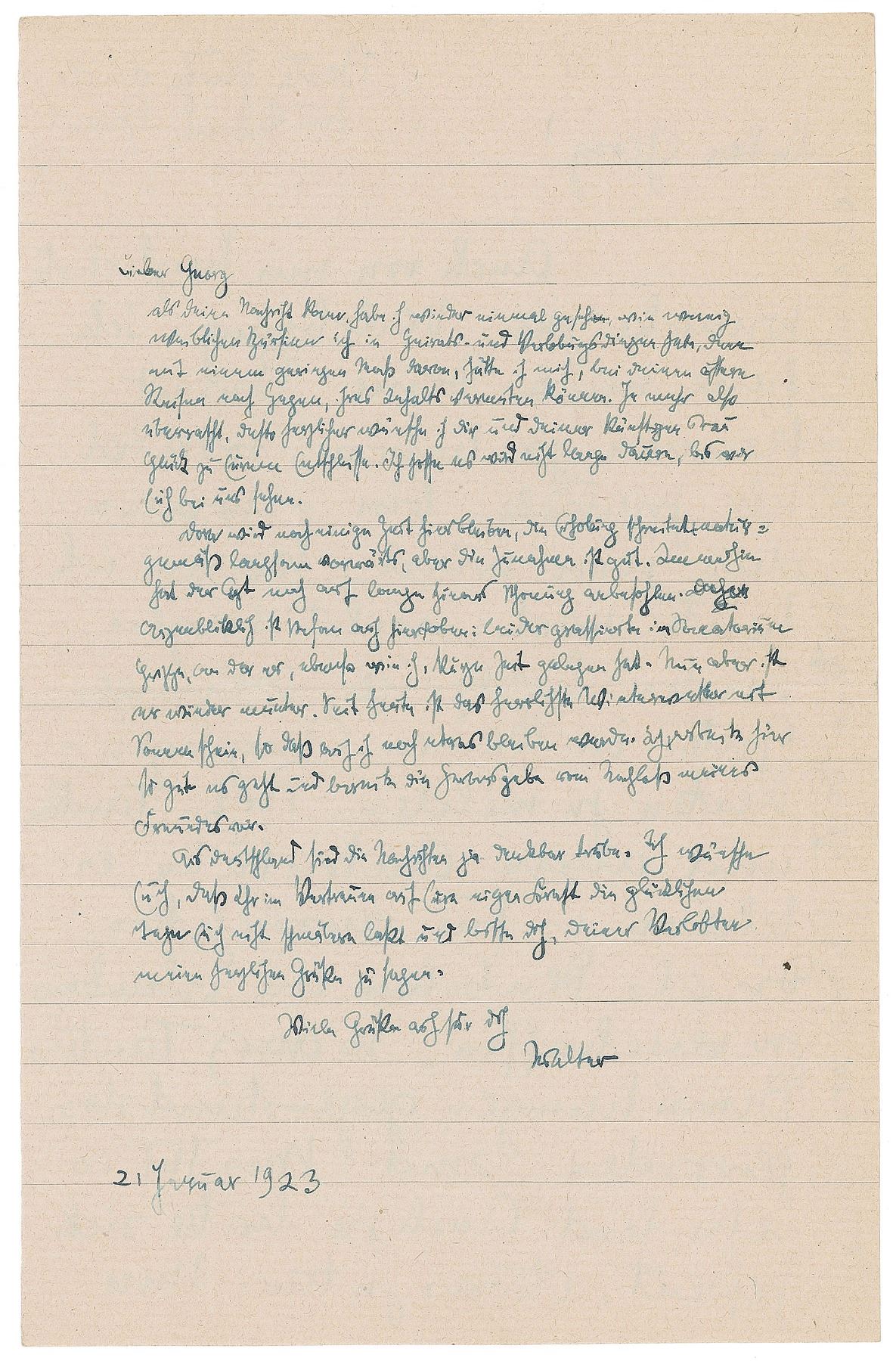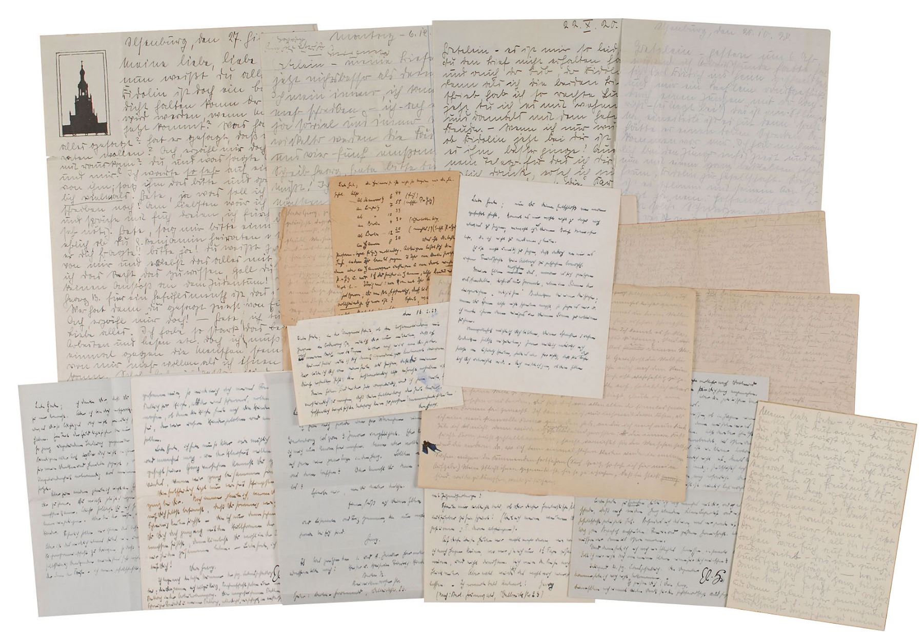 German philosopher and cultural critic (1892–1940) who made enduring and influential contributions to aesthetic theory and Western Marxism. Substantial archive of Benjamin family correspondence, comprising eighteen letters totaling thirty-nine pages, including one ALS by Walter Benjamin, eight ALSs by Georg Benjamin, three ALSs by Georg's fiancee Grete Kliem, and six ALSs by her friend Lisabeth. Most important is the ALS in German by Walter Benjamin, signed "Walter," one page, 4.5 x 7, January 21, 1923. In full (translated): "When your message arrived I once more noticed how undeveloped is my female intuition as to matters of marriage and engagement, for had I possessed only a minor quantity I might well have guessed at the reason for your frequent trips to Hagen. The more surprised I am, the more cordially I wish you and your future wife every happiness with your decision. I hope it will not be long before we see the both of you at our place.