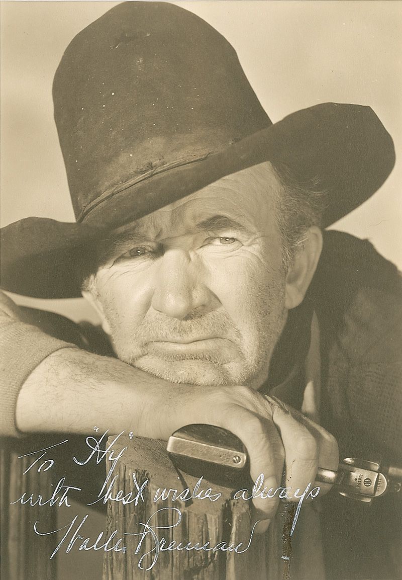 Vintage matte-finish 5 x 7 photo of Brennan with gun in hand, signed and inscribed in white ink “To ‘Hy,’ with best wishes always, Walter Brennan.” Matted to an overall size of 8 x 10. In fine condition, with light adhesive remnants to the lower border, slightly affecting the end of the sentiment.