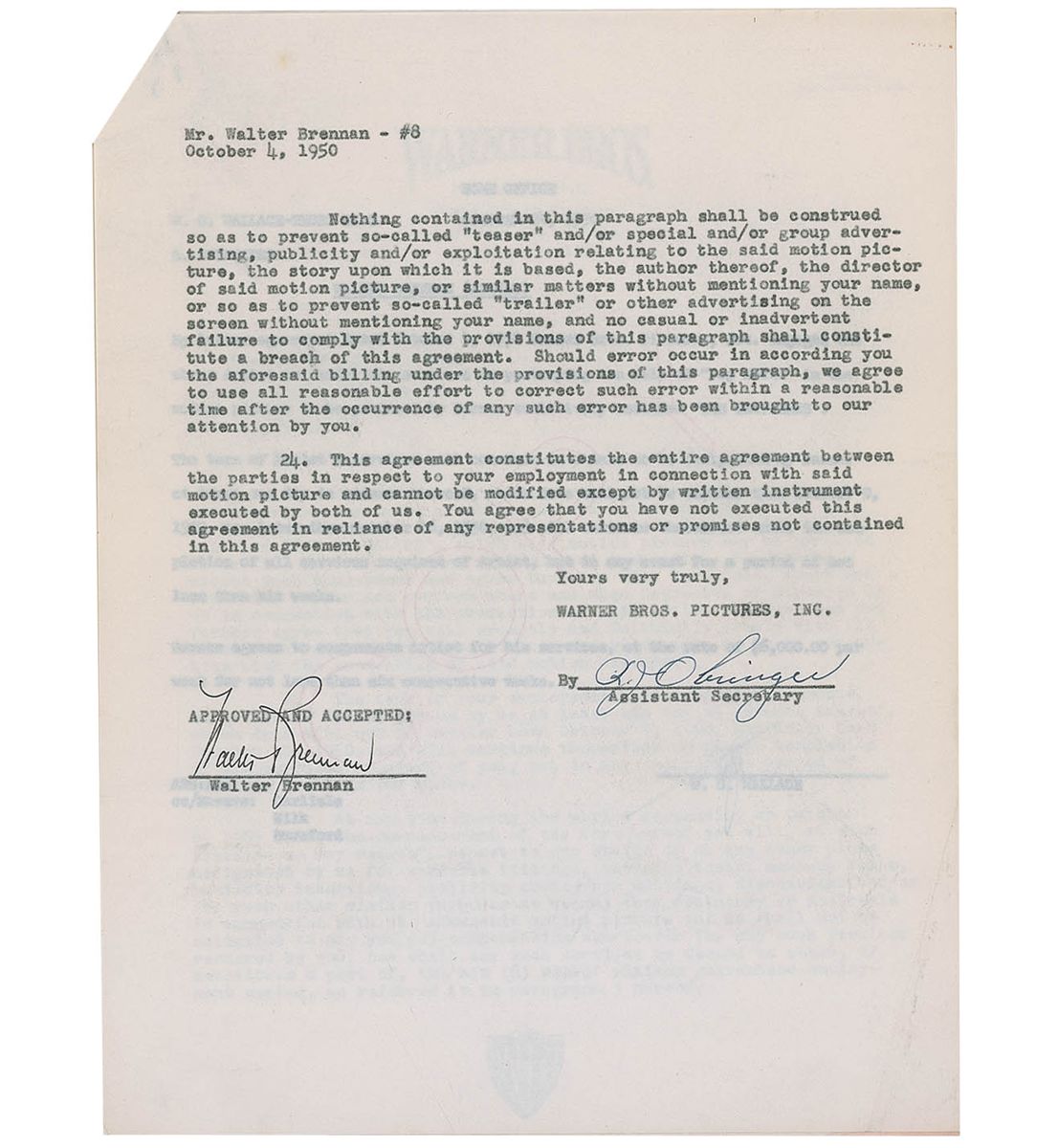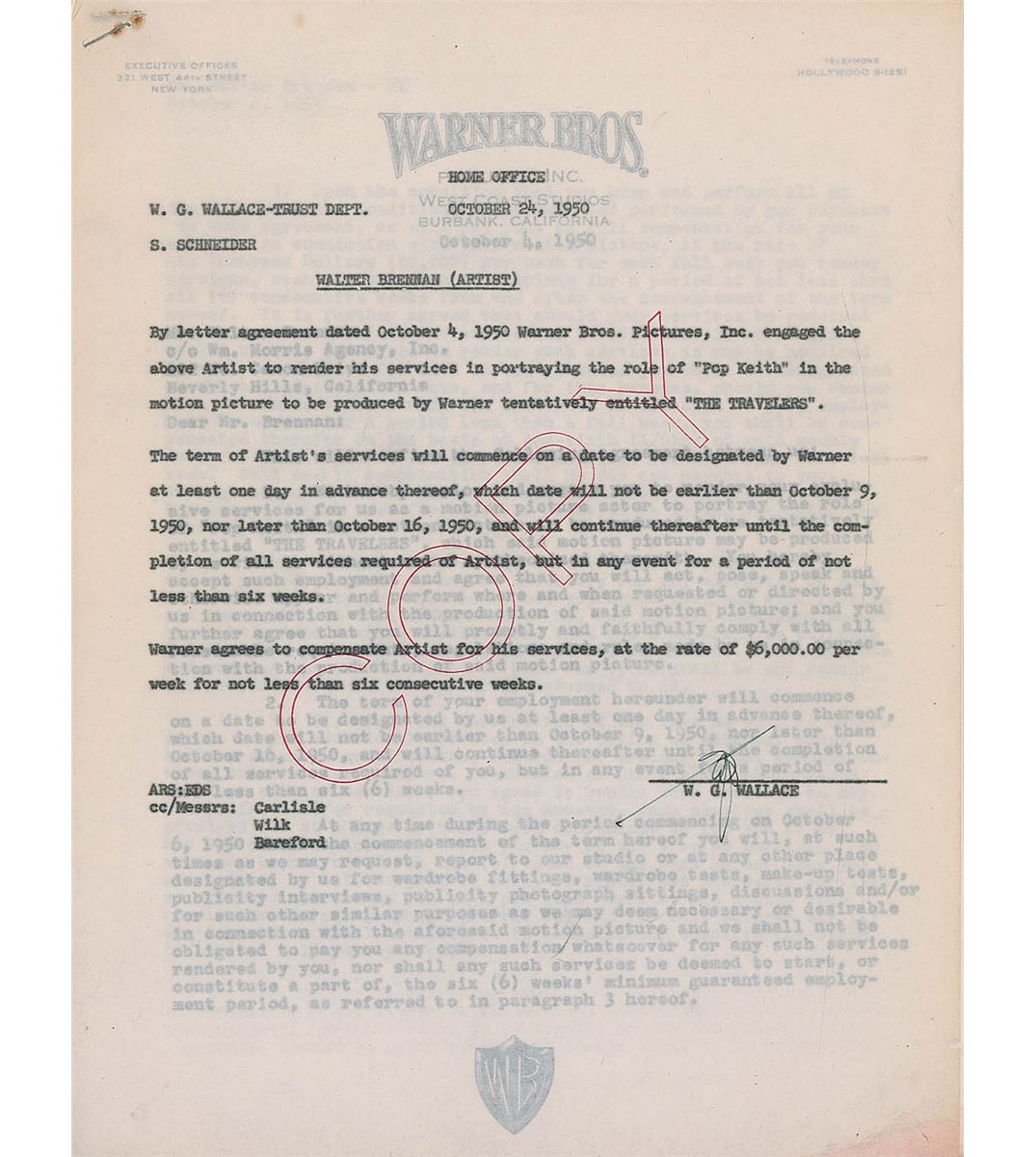 DS, nine onionskin pages, 8.5 x 11, October 4, 1950. Contract between Warner Bros. and Brennan for him “portray the role of ‘Pop Keith’ in a motion picture…tentatively entitled ‘The Travelers’…at the rate of Six Thousand Dollars ($6,000) per week.” In fine condition, with a crease to the lower right of the signed page, light damp staining to the lower right corner of the first few pages, a staple to the upper left corner,and slight staining to the upper left of the first page.