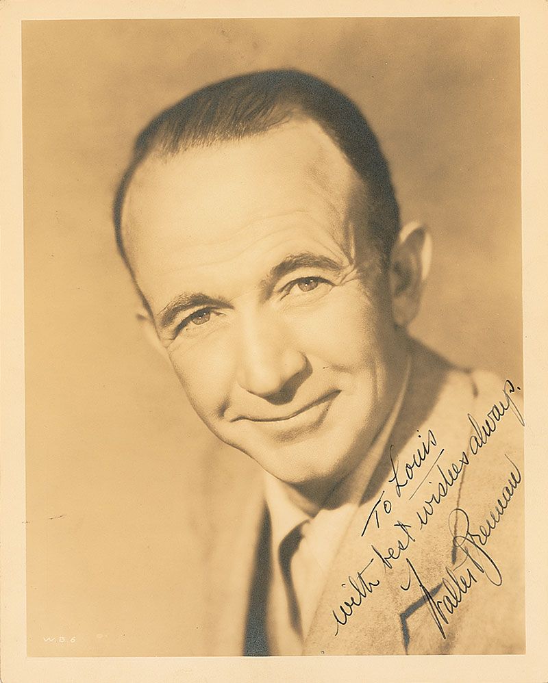 Vintage matte-finish 8 x 10 portrait of Brennan, signed and inscribed in fountain pen, “To Louis, with best wishes always, Walter Brennan.” In fine condition, with a few trivial surface marks and silvering to dark areas of the image.