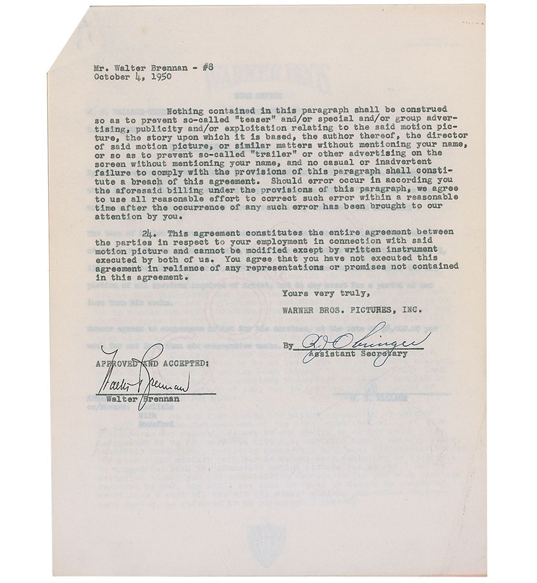 DS, nine onionskin pages, 8.5 x 11, October 4, 1950. Contract between Warner Bros. and Brennan for him “portray the role of ‘Pop Keith’ in a motion picture…tentatively entitled ‘The Travelers’…at the rate of Six Thousand Dollars ($6,000) per week.” In fine condition, with a crease to the lower right of the signed page, light damp staining to the lower right corner of the first few pages, a staple to the upper left corner,and slight staining to the upper left of the first page.