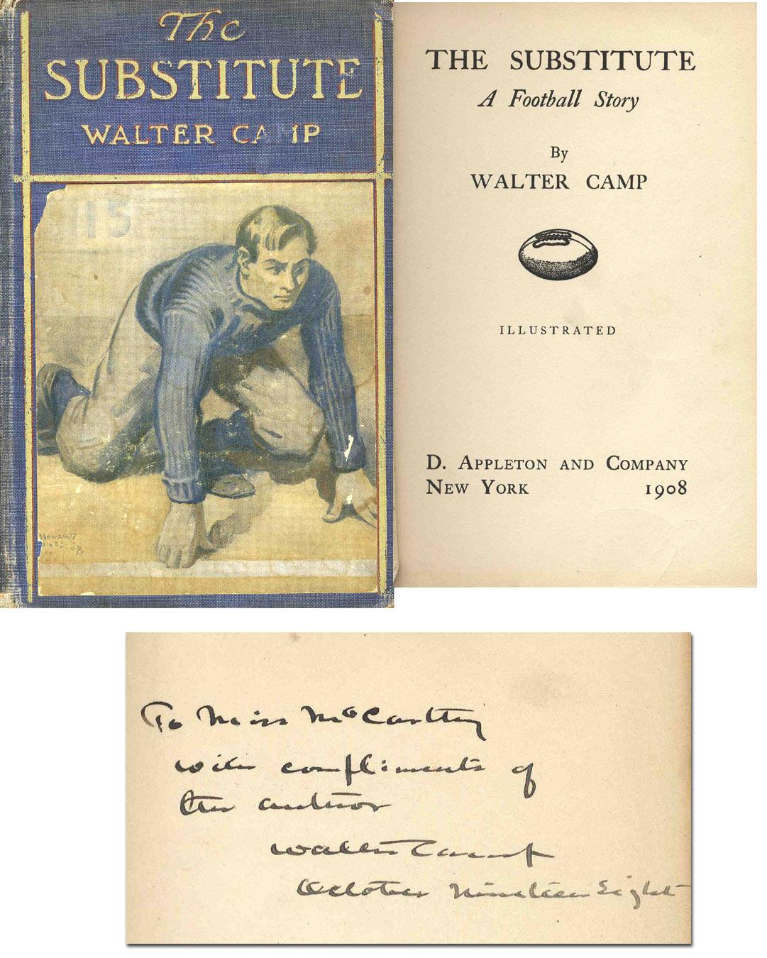 Walter Camp signed copy of ''The Substitute: A Football Story.'' New York: D. Appleton and Co.: 1908. Ink inscription on front free endpaper reads ''To Miss McCarthy / With compliments of the author / Walter Camp / October Nineteen Eight''. Outstanding text by the Yale football coach who popularized the game of football and shaped its rules by cutting the number of players from 15 to 11, designing the gridiron field pattern and instituting the quarterback position. In very good condition with split to rear joint and light overall wear.