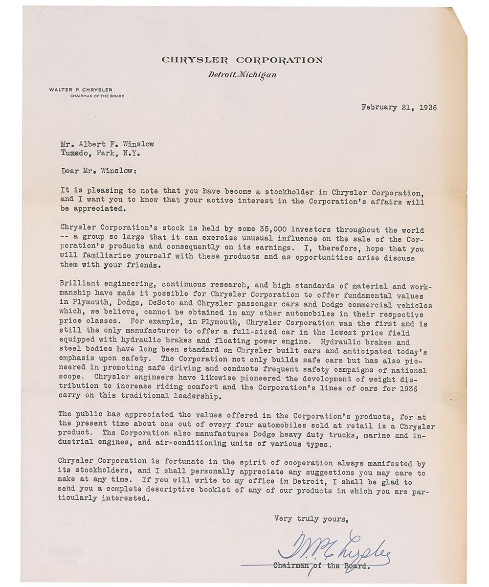 Automotive mogul (1875–1940) who founded the Chrysler Corporation. TLS signed “W. P. Chrysler,” one page, 8.25 x 10.75, Chrysler Corporation letterhead, February 21, 1936. Letter welcoming a new stockholder. In part: “It is pleasing to note that you have become a stockholder in Chrysler Corporation, and I want you to know that your active interest in the Corporation’s affairs will be appreciated. Chrysler Corporation’s stock is held by some 35,000 investors throughout the world—a group so large that it can exercise unusual influence on the sale of the Corporation’s products and consequently on its earnings.” Small edge separations to horizontal folds, scattered light toning, and show-through from a PSA label affixed to reverse, otherwise fine condition. Accompanied by a certificate of authenticity from PSA/DNA.
