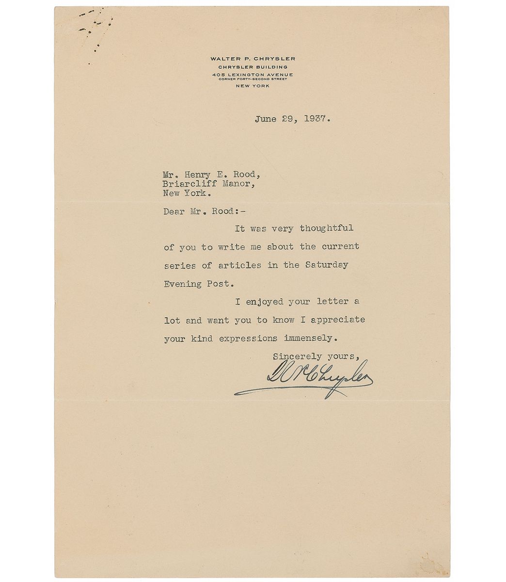 TLS signed “W. P. Chrysler,” one page, 7.25 x 10.5, personal letterhead, June 29, 1937. Letter to Henry E. Rood, in full: “It was very thoughtful of you to write me about the current series of articles in the Saturday Evening Post. I enjoyed your letter a lot and want you to know I appreciate your kind expressions immensely.” In fine condition, with two rusty paperclip marks to upper left corner and a small stain to lower right corner. Rood was the former editor of the New York Mail and Express.