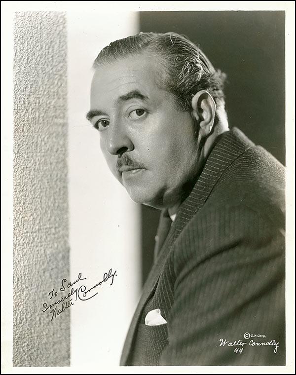 Character actor (1887–1940) whose trademark role was that of the exasperated business tycoon or newspaperman. Vintage glossy 8 x 10 photo, signed and inscribed in-person in fountain pen “To Saul, Sincerely, Walter Connolly.” Reverse of photo bears collector’s stamp date of May 25, 1935, the date the signature was acquired. In fine condition, with some scattered light creases and surface marks. The Saul Goodman collection.