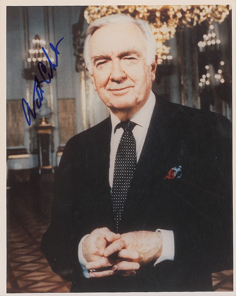 Color glossy 8 x 10 photo of Cronkite in the White House, signed in blue felt tip. In fine condition.