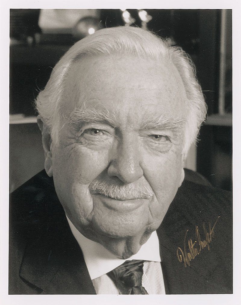 Two identical glossy 8 x 10 head-and-shoulders photos of Cronkite, each signed in gold ink. In overall fine condition.