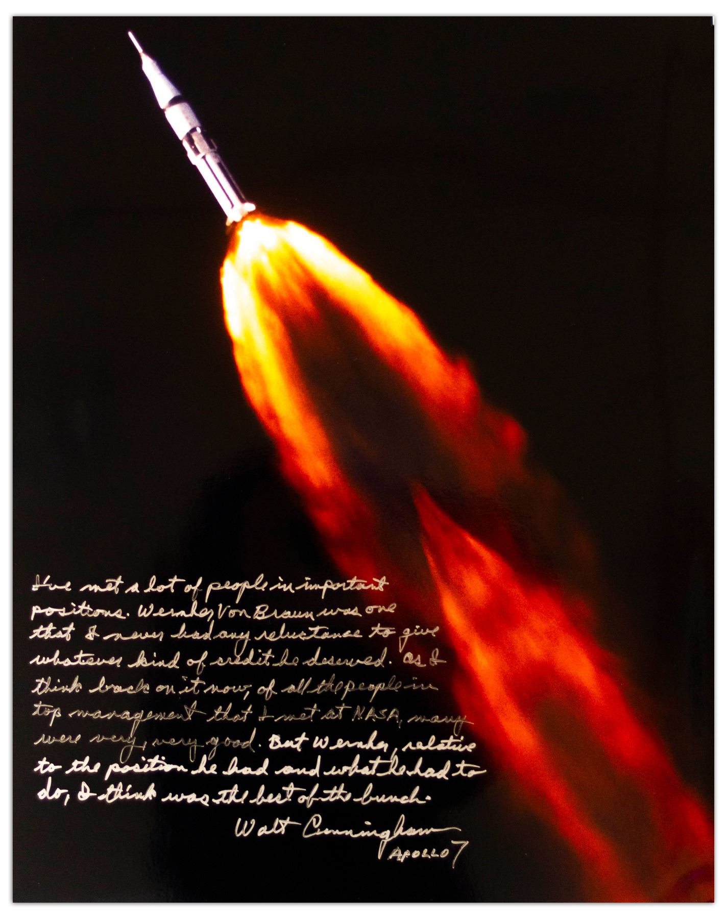 Walter Cunningham signed 16'' x 20'' dramatic photo of the Apollo 7 rocket launching into space on 11 October 1968. Cunningham writes a very personal message honoring Wernher von Braun and his importance to America's Apollo program, ''I've met a lot of people in important positions. Wernher von Braun was one that I never had any reluctance to give whatever kind of credit he deserved. As I think back on it now, of all the people in top management that I met at NASA, many were very, very good. But Wernher, relative to the position he had and what he had to do, I think was the best of the bunch. / Walt Cunningham / APOLLO 7''. Near fine condition.