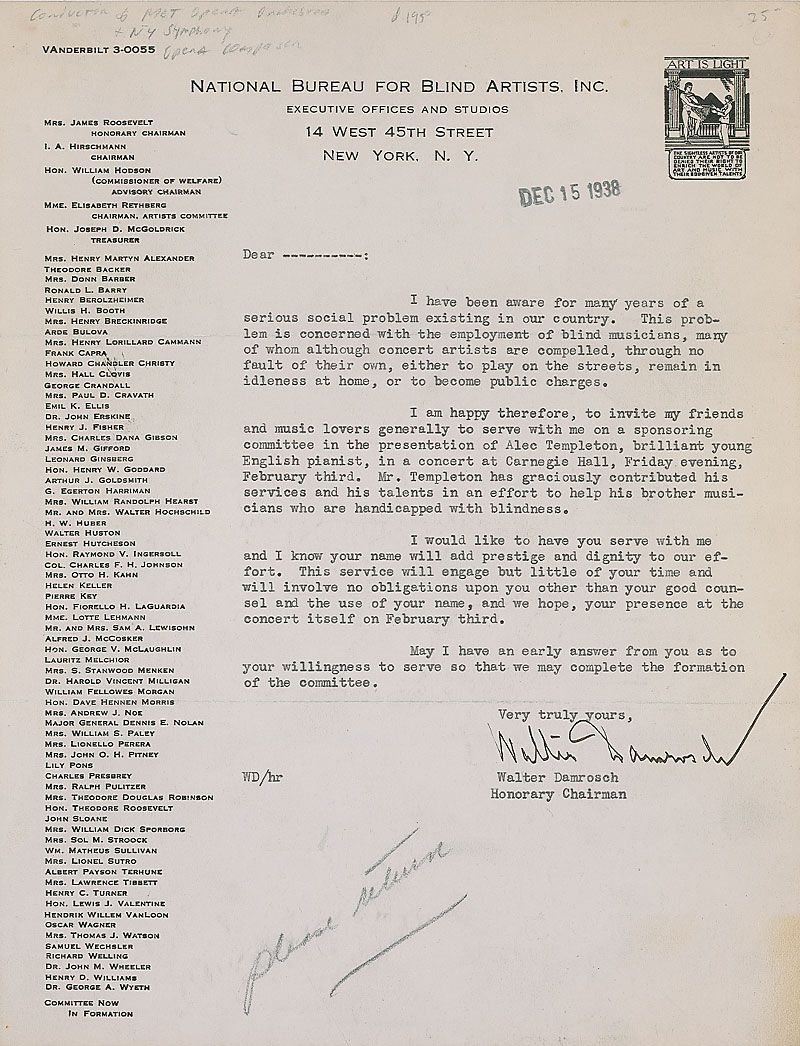 TLS, one page, 8.5 x 11, National Bureau for Blind Artists, Inc. letterhead, December 15, 1938. Form letter soliciting a committee to benefit blind musicians. In part: “I have been aware for many years of a serious social problem existing in our country. This problem is concerned with the employment of blind musicians, many of whom although concert artists are compelled, through no fault of their own, either to play on the streets, remain in idleness at home, or to become public charges. I am happy therefore, to invite my friends and music lovers generally to serve with me on a sponsoring committee in the presentation of Alec Templeton…in a concert at Carnegie Hall.” Pencil notations to top and bottom, and some light toning to lower right, otherwise fine condition.