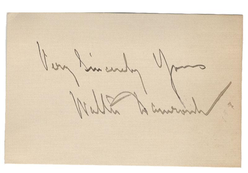 Walter Johannes Damrosch ( 1862 – 1950). German-born American conductor. Signed card. 5" x 3 1/4". "Sincerely yours, Walter Damrosch". Excellent.
