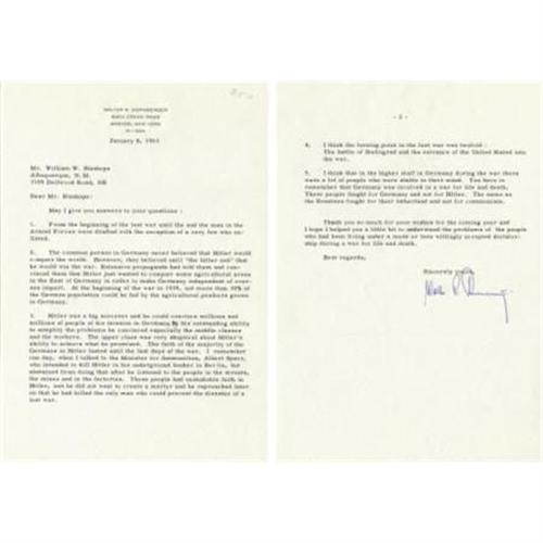<B>Walter Dornberger Typed Letter Signed.</B></I> Excellent content TLS "<I>Walter R. Dornberger</B></I>", 2 pages, 7.25" x 10.5", Boston, NY, Jan. 8, 1963, to a William Stanhope in response to his questions on World War II and Germany. In part: "<I>The common person in Germany never believed that Hitler would conquer the world. However, they believed until 'the bitter end' the he would win the war. Extensive propaganda had told them and convinced them that Hitler just wanted to conquer some agricultural areas in the East of Germany in order to make Germany independent of oversea import... Hitler was a big sorcerer and he could convince millions and millions of people of his mission in Germany... The faith of the majority of the Germans in Hitler lasted until the last days of the war. I remember, one day, when I talked to the minister of ammunition, Albert Speer, who intended to kill Hitler in his underground bunker in Berlin, but abstained from doing that after he listened to the people in the streets...</B></I>" Much more excellent content and in near fine condition. <BR><BR>Dornberger (1895-1980) served as an artillery officer in the German Army in both World Wars and was a leader of Germany's V2 rocket program.<BR><BR><b>Shipping:</b> Flat Material, Small (<a target="_blank" href="http://www.heritageauctions.com/common/shipping.php">view shipping information</a>)