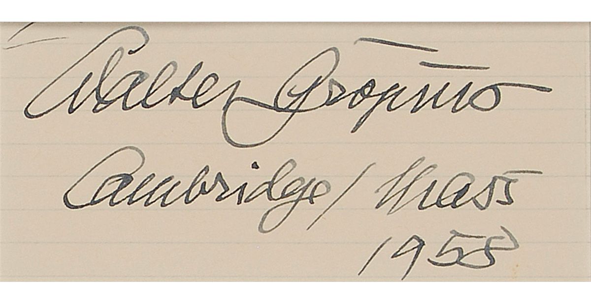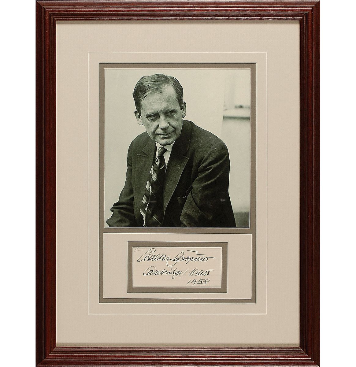 Highly influential German architect (1883–1969) who founded and designed the Bauhaus and whose other important buildings include the Harvard Graduate Center in Cambridge, Massachusetts and the Pan Am Building in New York City. Vintage fountain pen signature, “Walter Gropius, Cambridge/Mass 1958,” on an off-white card. Double matted and framed with a portrait of Gropius to an overall size of 13.5 x 17.75. In fine condition, with a stray ink mark to top edge.