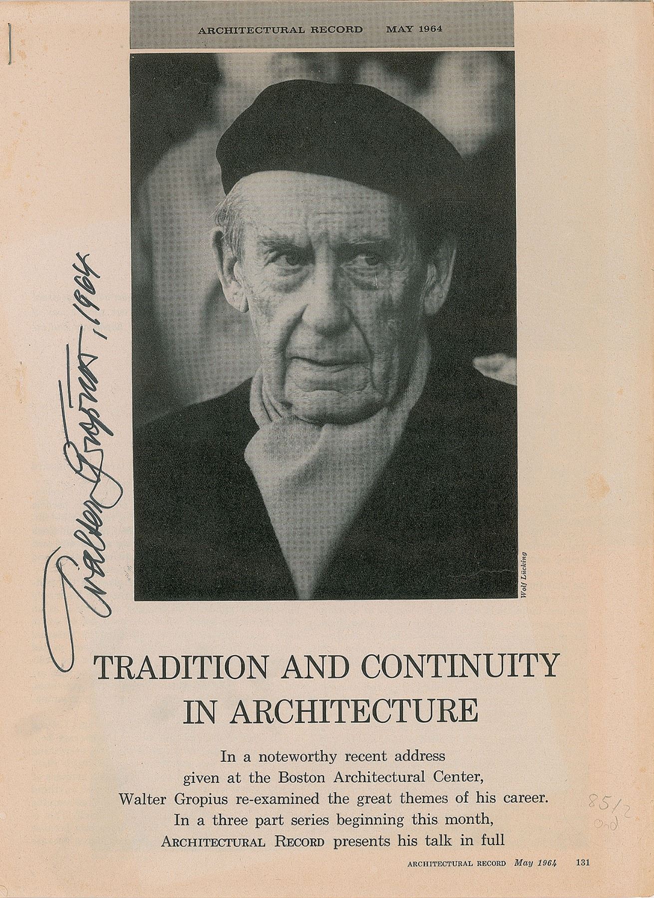 Highly influential German architect (1883-1969) who founded and designed the Bauhaus and whose other important buildings include the Harvard Graduate Center in Cambridge, Massachusetts, and the Pan Am Building in New York City. Stapled article removed from the May 1964 publication of Architectural Record, six total pages, 8.5 x 11.75, signed vertically on first page next to his image in black felt tip, "Walter Gropius, 1964." In fine condition, with some faint toning and light handling wear.