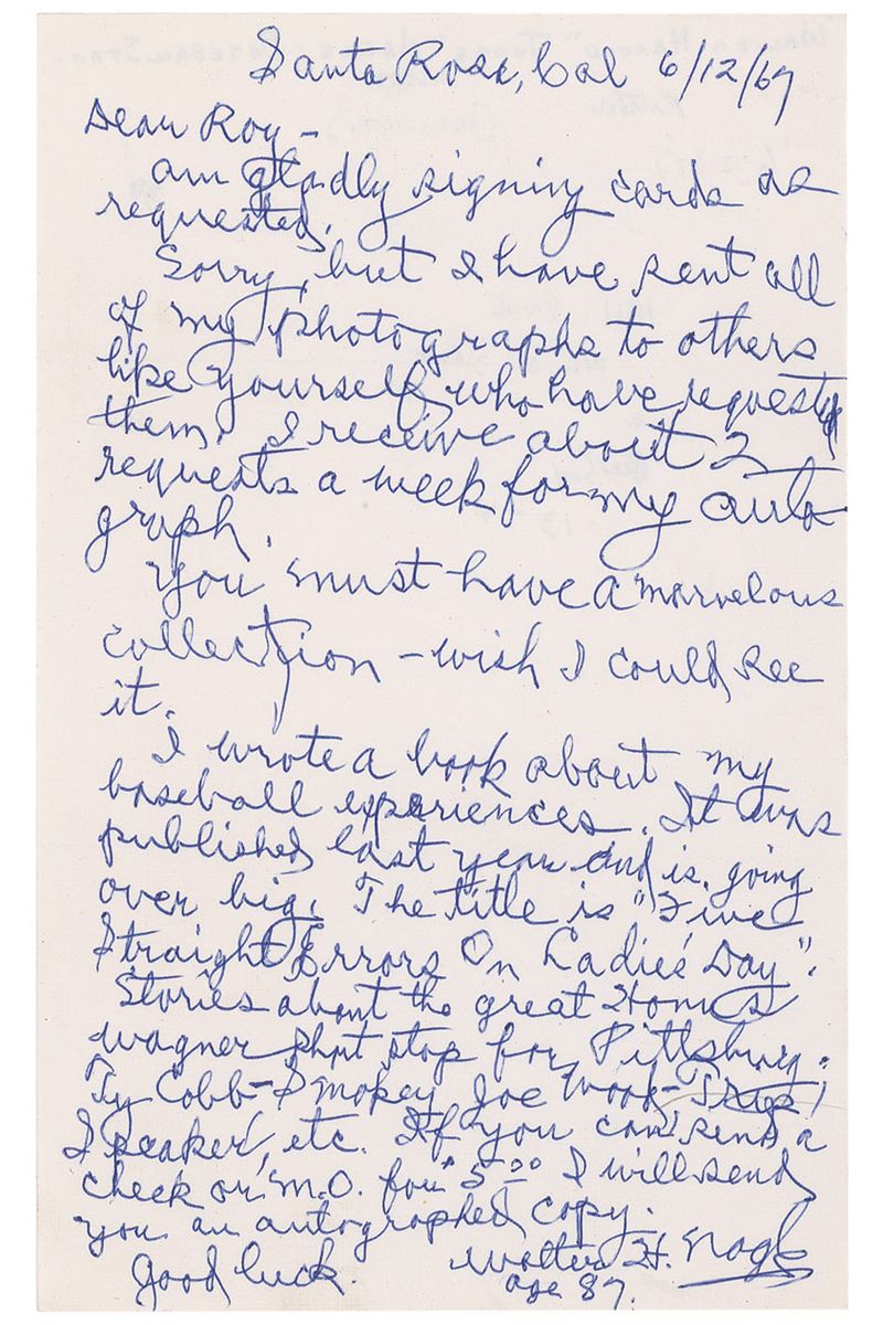 Pitcher (1880–1971) who played one season for the Pirates and Red Sox. ALS signed “Walter H. Nagle,” one page, 5 x 8, June 12, 1967. Letter to an admirer mentioning his new book. In part: “I wrote a book about my baseball experiences. It was published last year and is going over big. The title is ‘Five Straight Errors on Ladies’ Day.’ Stories about the great Honus Wagner, short stop for Pittsburgh. Ty Cobb—Smokey Joe Wood—Tris Speaker, etc.” In fine condition.