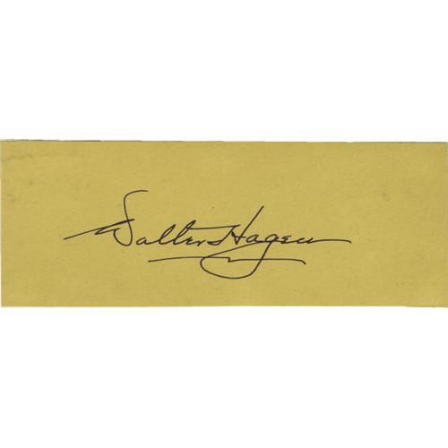 <B>Circa 1940 Walter Hagen Signed Cut Signature.</B></I> The first American to win the British Open appears in the boldest of black fountain pen ink, perfectly centered upon a 2x5.5" slip of yellow album page paper. No finer example could possibly exist. <I>LOA from PSA/DNA. LOA from James Spence Authentication.</B></I><BR><BR><b>Shipping:</b> Flat Material, Small (<a target="_blank" href="http://www.heritageauctions.com/common/shipping.php">view shipping information</a>) <BR><BR><B>Important notice