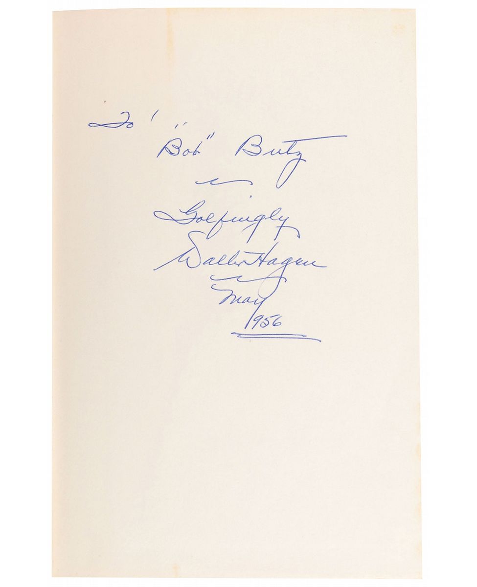 Signed book: The Walter Hagen Story. First edition, first printing. NY: Simon & Schuster, 1956. Hardcover with dust jacket, 6.25 x 9.25, 342 pages. Signed and inscribed on the first free end page, “To ‘Bob’ Butz, Golfingly, Walter Hagen, May 1956.” Autographic condition: fine, with a few small spots of mild toning. Book condition:VG/VG-.