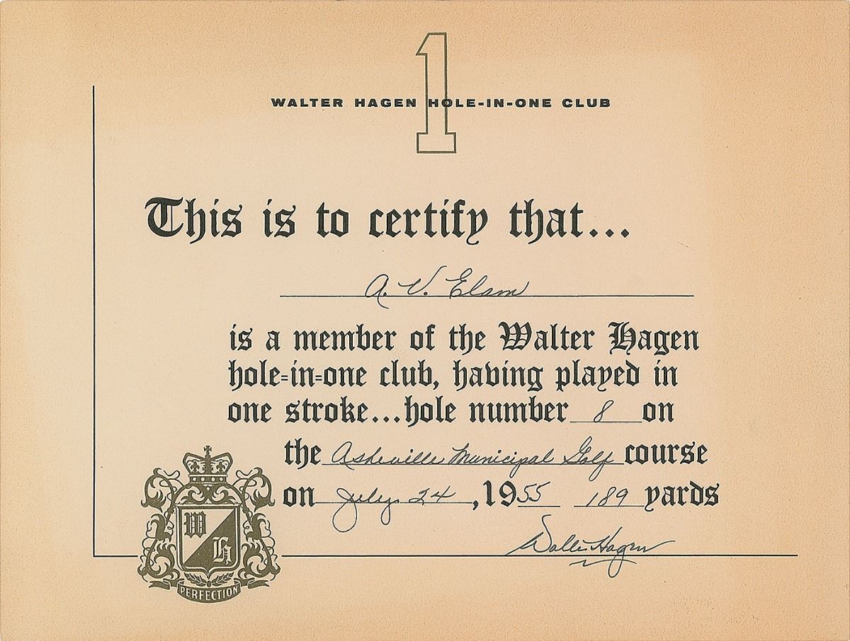 DS, one page, 11.75 x 9, July 24, 1955. Certificate for the Walter Hagen Hole-in-One Club awarded to A. V. Elam for “having played one stroke…hole number 8 on the Asheville Municipal Golf course…189 yards.” Signed at the bottom in fountain pen by Hagen. In fine condition, with light perimeter toning. Accompanied by the original mailing envelope and transmittal letter, as well as a certificate for Canada Dry’s hole-in-one club.