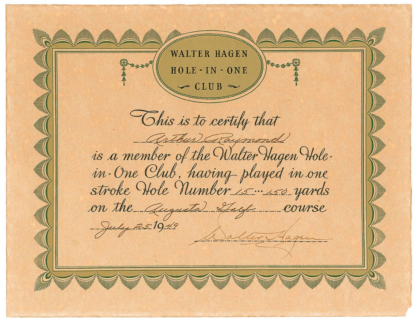 Partly-printed DS, one page, 11.75 x 9, July 25, 1949. Document certifying that Arthur Raymond is a member of the Walter Hagen Hole-in-One Club, having aced Hole #15 at Augusta. In fine condition, with a mild shade of uniform toning and a bit of light rippling. Accompanied by an unsigned glossy 14 x 11 photo of Hagen.