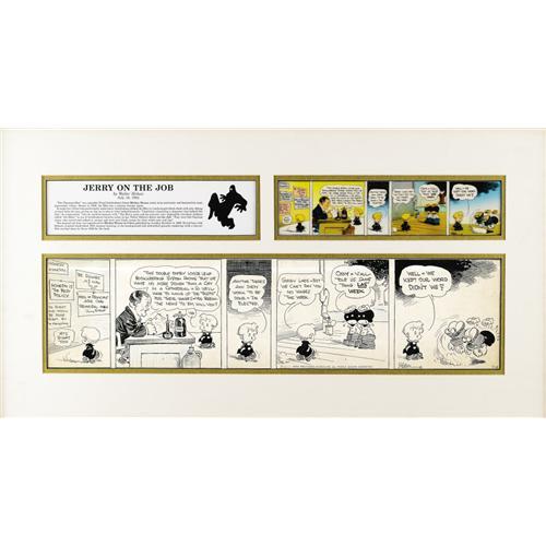 <B>Walter Hoban - Jerry on the Job Daily Comic Strip Original Art, dated 7-10-24 (King Features Syndicate, 1924).</B></I> This hilarious <I>Jerry on the Job</B></I> daily features the black twins, the Blots, who were said to be the inspiration for Mickey Mouse's famed nemesis -- the Phantom Blob. As a bonus, the daily is framed alongside a hand-painted, airbrushed gouache rendering of the strip, with a line-art film overlay, done by Steve Oliff. This recreated piece was used in the 1988 limited edition coffee table book, <B>Mickey Mouse in Color</B></I>. The image area of the Walter Hoban daily is 24" x 5.75", and the art is in Very Good condition. <I>From the Estate of Bruce Hamilton.</B></I> <BR><BR><B>Important notice:</B> Heritage usually auctions material at the rate of 200-250 lots per hour. On some occasions eBay Live bid software or the Internet may not be able to keep up with the pace of the auction. We recommend placing a realistic absentee bid now as insurance to avoid disappointment. Occasionally the auctioneer may eliminate or reject an eBay Live bid, and the auctioneer may also reopen a lot after the close of the eBay live bidding (usually because we missed an audience bid), and may reject your bid even if it shows you as the winning bidder. By bidding via eBay Live, you agree that Heritage may award the lot to another bidder at its sole discretion under the circumstances described above or any other reasonable circumstances. Since eBay bids are not shown to us until we open the lot on the floor, we treat those bids just like floor bids. In most cases the floor responds before the eBay bid is presented to us, due to Internet lag time, so for consistency we have made it a policy that floor bids are always considered first over tie eBay live bids. Also please note that all Heritage lots purchased through eBay Live carry a 22.5% Buyer's Premium. Please make sure you read the Terms and Conditions before you bid. This lot is being auctioned in conjunction with a live floor auction by Heritage Auction Galleries. All final auction and invoice information will be supplied by Heritage Auction Galleries, and all other information should be considered preliminary. Lot:41001 <BR><BR><B>Winning Notification and Billing:</B> After the FINAL session in this auction is complete, Heritage will send e-mail and snail mail invoices. This process normally takes several days. All final auction and invoice information will be supplied by Heritage Auction Galleries, and all other information should be considered preliminary. <BR><BR>This auction will be conducted on a live auction floor and over the Internet through eBay Live. If you choose to place an absentee bid, please take a moment to <font color='#0000ff'><u><a href='http://pages.ebay.com/liveauctions/help/before/laabsentee.html'>learn how eBay Live absentee bidding works</a></u></font><font color='#000000'>