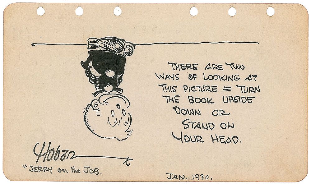 Original vintage signed ink sketch of Jerry upside down on an off-white 6 x 3.5 album page dated January 1930, signed in black ink, “There are two ways of looking at this picture—turn the book upside down or stand on your head. Hoban, ‘Jerry on the Job.’” In fine condition.