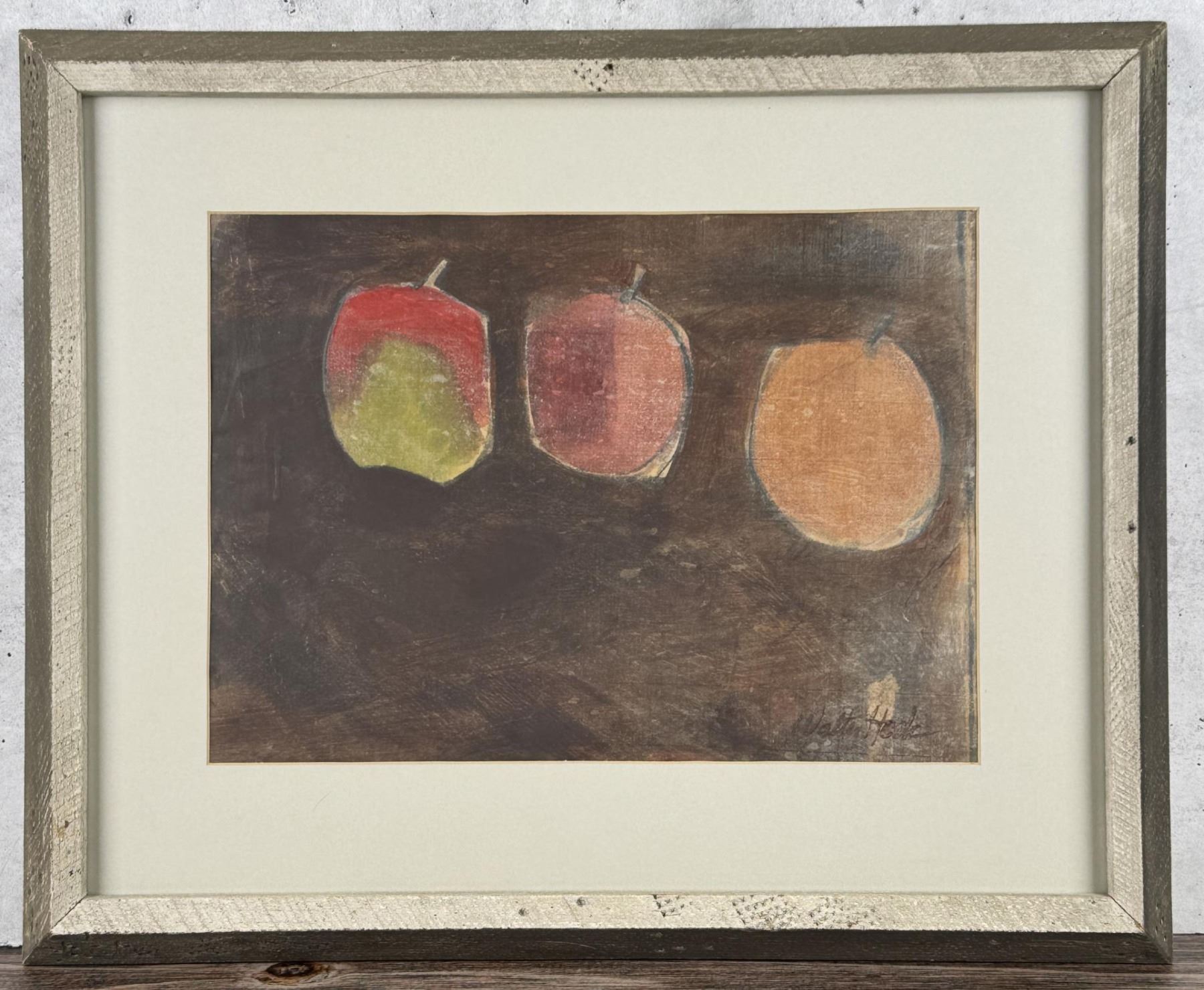 Title is Fruit Still Life. 10" by 15" unframed. 18" by 22" framed. Gouache on Paper. Walter Hook (1919 - 1989) was active/lived in Montana. Walter Hook is known for Post-war surrealist painting, sculpture. Walter Hook, painter and printmaker, was a Montana native. He received his Masters Degree in Art from the University of New Mexico in 1950, and was hired as chair of the University of Montana Art Department. Walter Hook received some 90 awards from juried exhibitions and had over 80 one- man shows. In 1972 he was elected an Associate of the National Academy of Design, the nation's oldest artist's honorary organization. His mediums painting, sculpture, mixed media, printmaking. His style is post-war surrealism.