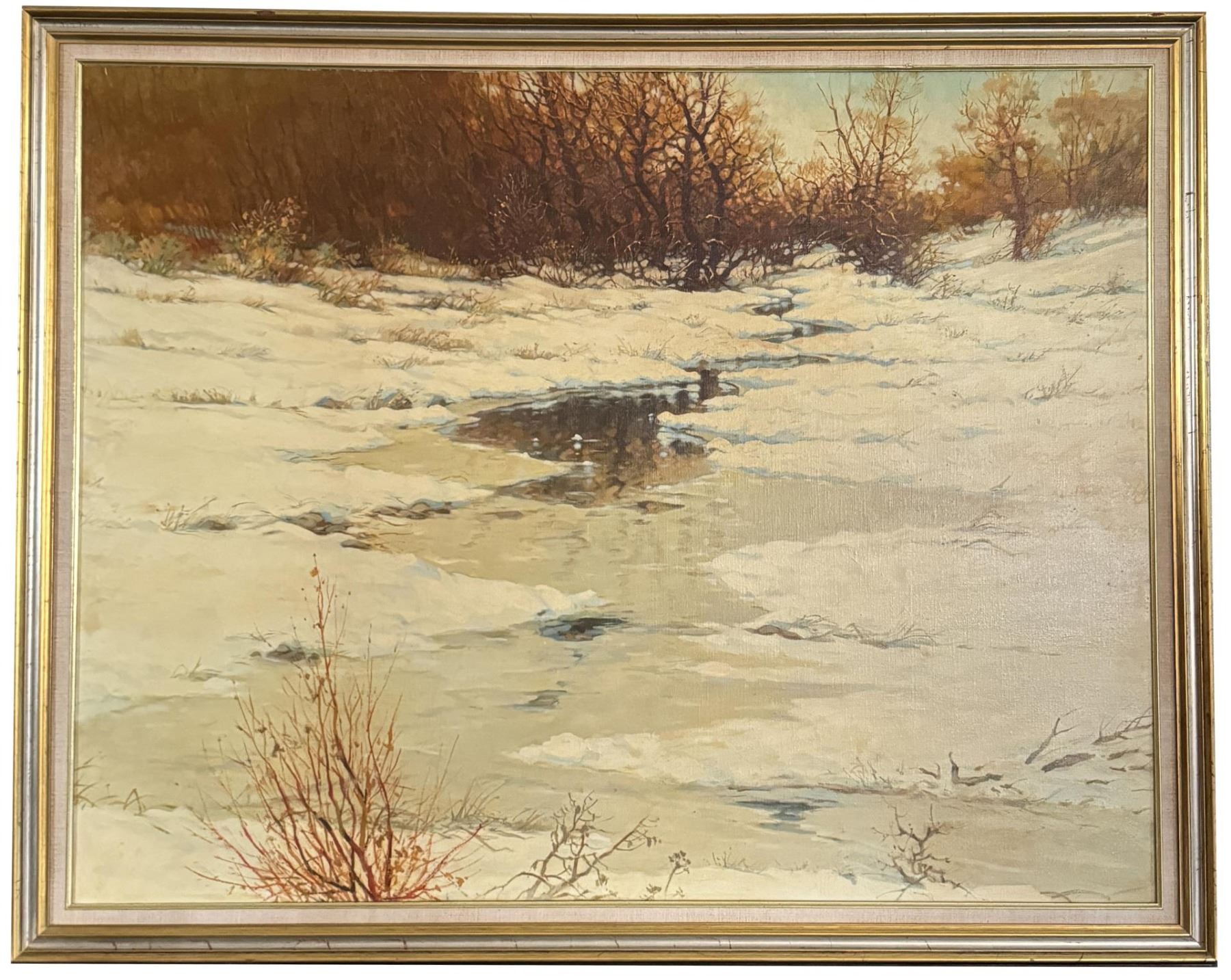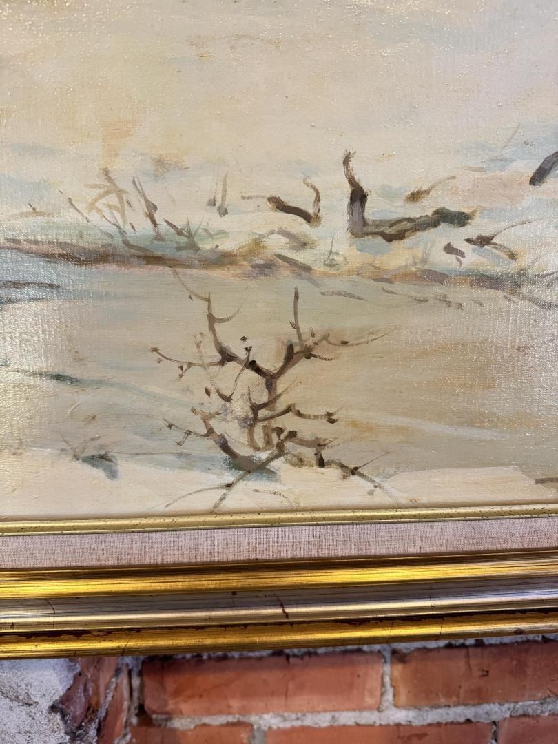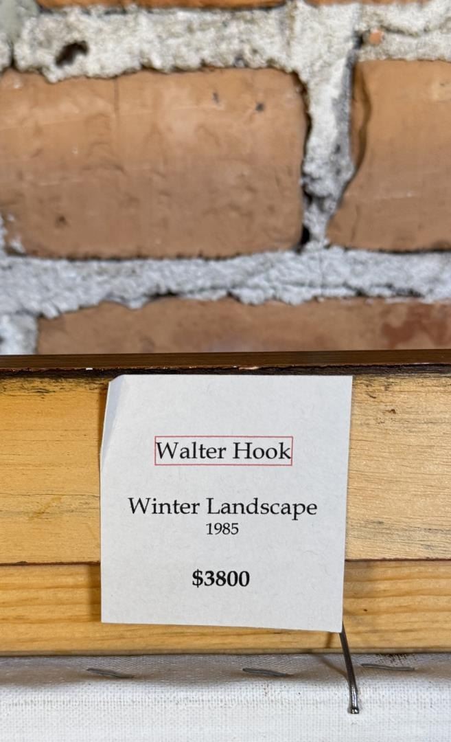 Title is Winter Landscape. Oil on Canvas. 47 1/2" by 59" framed. Provenance: The Estate of Walter Hook. Walter Hook (1919 - 1989) was active/lived in Montana. Walter Hook is known for Post-war surrealist painting, sculpture. Walter Hook, painter and printmaker, was a Montana native. He received his Masters Degree in Art from the University of New Mexico in 1950, and was hired as chair of the University of Montana Art Department. Walter Hook received some 90 awards from juried exhibitions and had over 80 one- man shows. In 1972 he was elected an Associate of the National Academy of Design, the nation's oldest artist's honorary organization. His mediums painting, sculpture, mixed media, printmaking. His style is post-war surrealism.