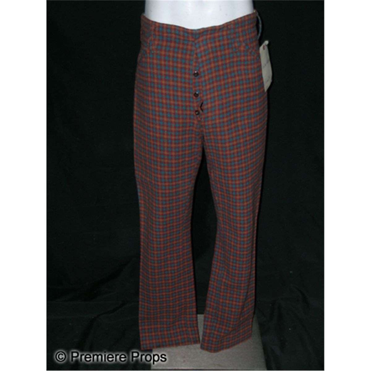 Plaid pants colored in orange and blue, worn by Walter Huston as Doc Holliday in Howard Hughes' classic western The Outlaw (1943). The film was notorious for challenging the censors of the time with its generous displays of star Jane Russell's cleavage. Its plotline followed the struggle between Holliday and Billy the Kid over Russell's character. Includes a United Costumers label on the inner waist with Huston's name handwritten on it. Huston, the father of John Huston, is most famous for his portrayal of Mr. Scratch in The Devil and Daniel Webster.