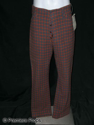 Plaid pants colored in orange and blue, worn by Walter Huston as Doc Holliday in Howard Hughes' classic western The Outlaw (1943). The film was notorious for challenging the censors of the time with its generous displays of star Jane Russell's cleavage. Its plotline followed the struggle between Holliday and Billy the Kid over Russell's character. Includes a United Costumers label on the inner waist with Huston's name handwritten on it. Huston, the father of John Huston, is most famous for his portrayal of Mr. Scratch in The Devil and Daniel Webster.