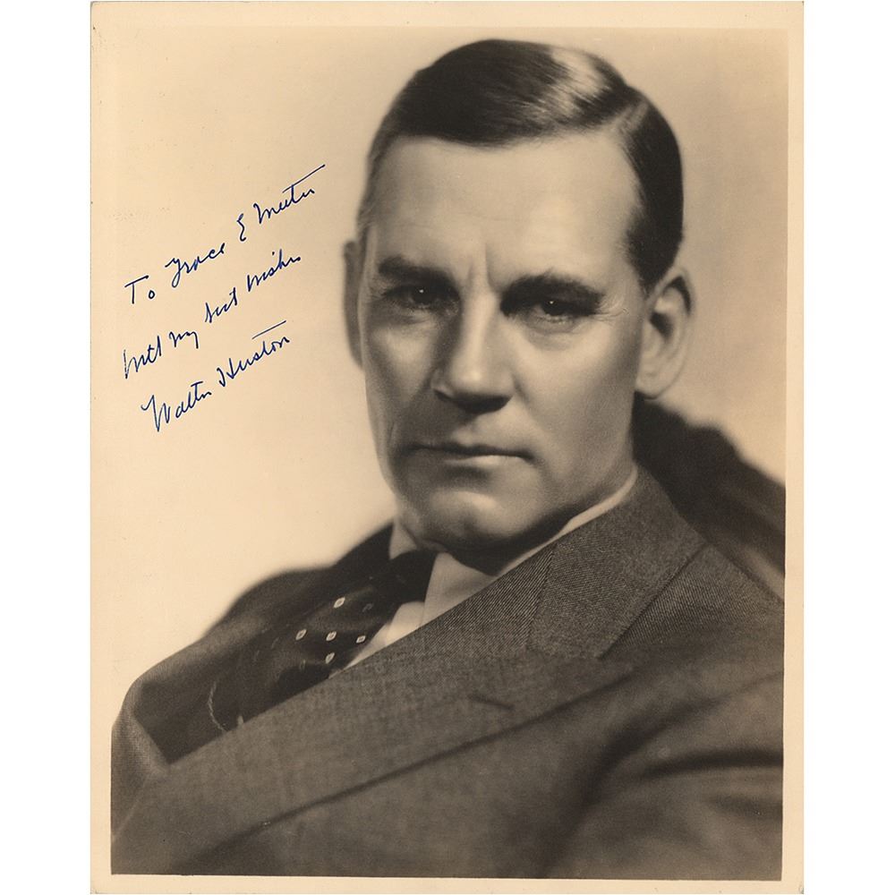 Vintage sepia matte-finish 8 x 10 portrait photo of the young Oscar-winning actor in a jacket and tie, signed and inscribed in fountain pen, "To Grace E. Minton, with my best wishes, Walter Huston." In fine condition, with some subtle light silvering to darker areas of the image.