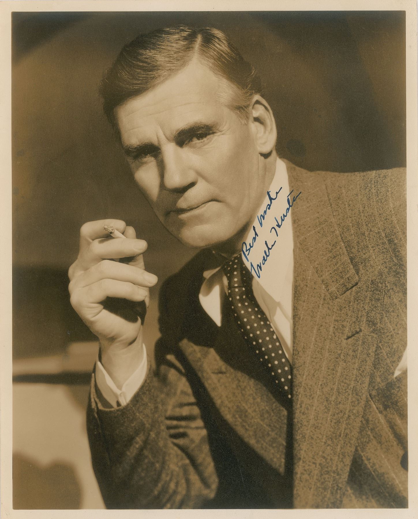 Vintage matte-finish 8 x 10 photo of the Oscar-winning actor coolly smoking a cigarette, signed in fountain pen, "Best wishes, Walter Huston." In very fine condition.