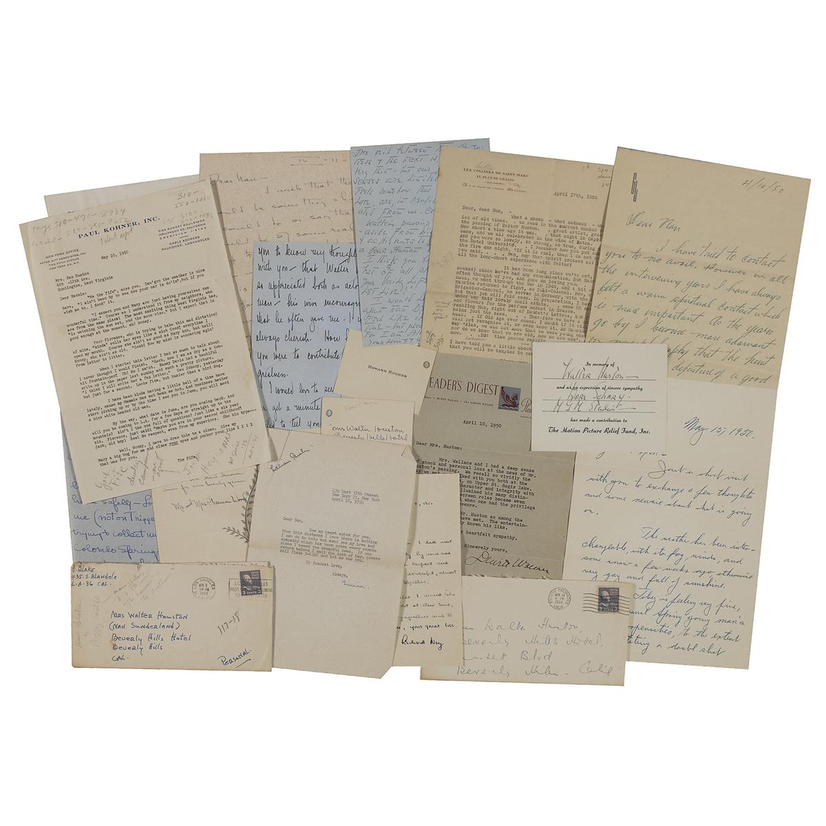Collection of 34 letters of condolence, both TLSs and ALSs, sent to Huston’s wife Nan Sutherland Huston, after Walter’s passing on April 7, 1950, sent by various stars of the stage and screen, writers, and other notables, most dating between April and May 1950. Signers include; Katharine Hepburn, Agnes Moorehead, Theda Bara, Lillian Gish, Paul Kohner, Alan Napier, John Huston, William Morris, Mary Wickes, and Millard Tydings. A small sampling of the letters include: Katharine Hepburn: “I wish that there could be something which I could do or say that could be some real help to you … I think of your coming backstage so short a time ago & how gay you and Walter looked together & hoe happy you made me fell about the play.”; Agnes Moorehead: “Walter was so appreciated both as actor and man—his wise encouragement that he often gave me–I will always cherish.”; Theda Bara: “Walter’s passing was a shock–aside from his great talent and achievements, he was such a dear human being. I think you both expressed the best of all philosophies in your daily life ‘Live & Let Live.’” All the letters are accompanied by their original mailing envelopes. Also included is an unsigned personal calling card from Howard Hughes, in a small envelope (probably delivered with flowers), addressed in another hand to Huston’s wife. In very good to fine overall condition. A fitting tribute to the patriarch of the Huston family.
