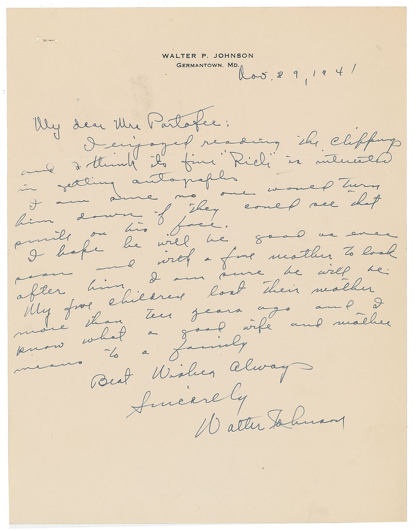 Heartfelt handwritten letter signed "Walter Johnson," one page, 8.5 x 11, personal letterhead, November 29, 1941. Letter to Mrs. Partafee, in full: "I enjoyed reading the clipping and I think it's fine 'Rich' is interested in getting autographs. I am sure no one would turn him down if they could see that smile on his face. I hope he will be good as ever soon and with a fine mother to look after him I am sure he will be. My five children lost their mother more than ten years ago and I know what a good wife and mother means to a family. Best wishes always." In fine condition, with staples holes to upper left.