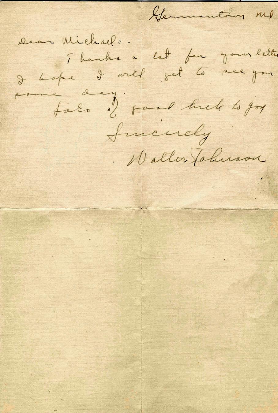 Walter Johnson autograph letter signed. Walter ''The Big Train'' Johnson writes to a fan and signs in bold black ink, ''Walter Johnson''. Reads in full, ''Germantown, MD / Dear Michael / Thanks a lot for your letter. I hope I will get to see you some day. Lots of good luck to you / Sincerely / Walter Johnson''. Letter measures 7.25'' x 10.5''. Usual letter folds, else near fine.