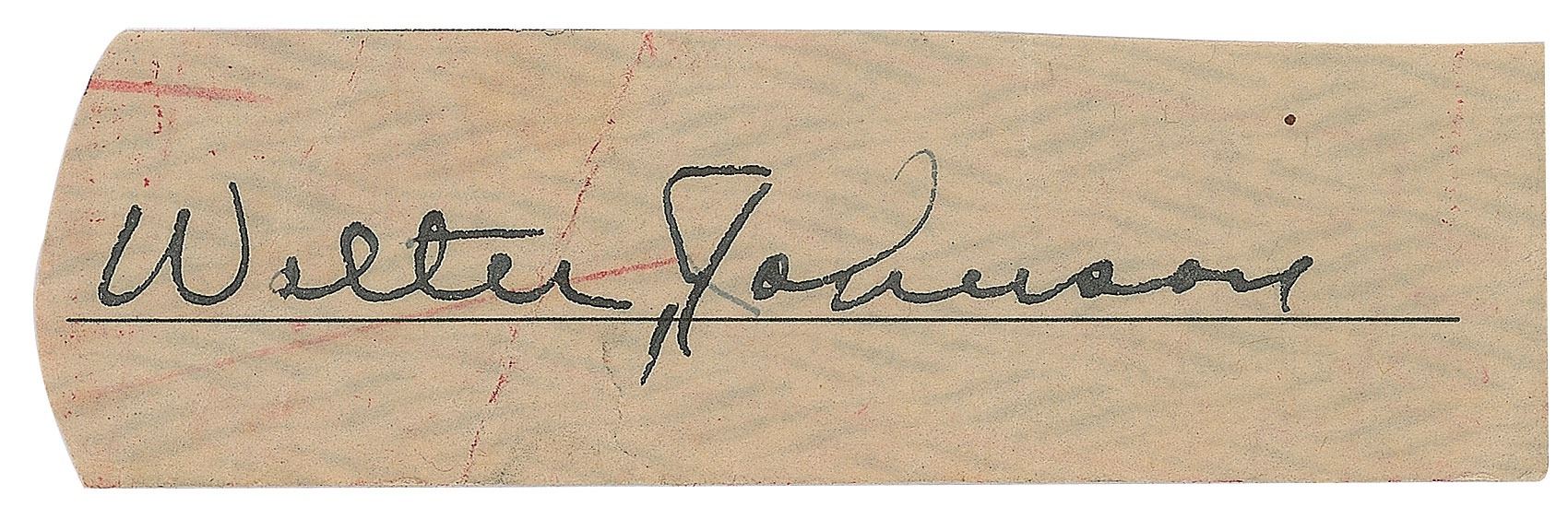 Vintage ink signature, "Walter Johnson,” on an off-white 2.75 x .75 slip clipped from a bank check. In fine condition.
