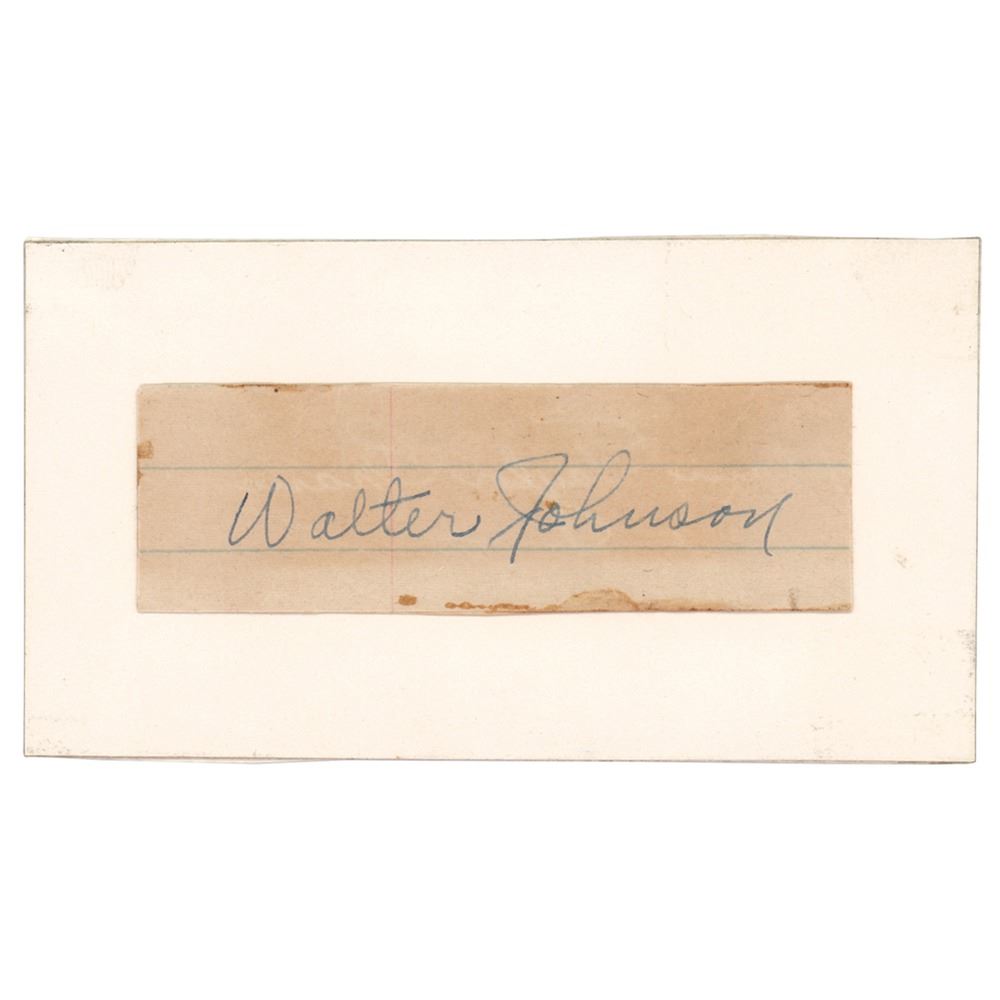 Vintage ink signature, "Walter Johnson,” on an off-white 3.25 x 1 slip affixed to a slightly larger mount. In fine condition, with light toning, and some edge stains which could be easily matted out.