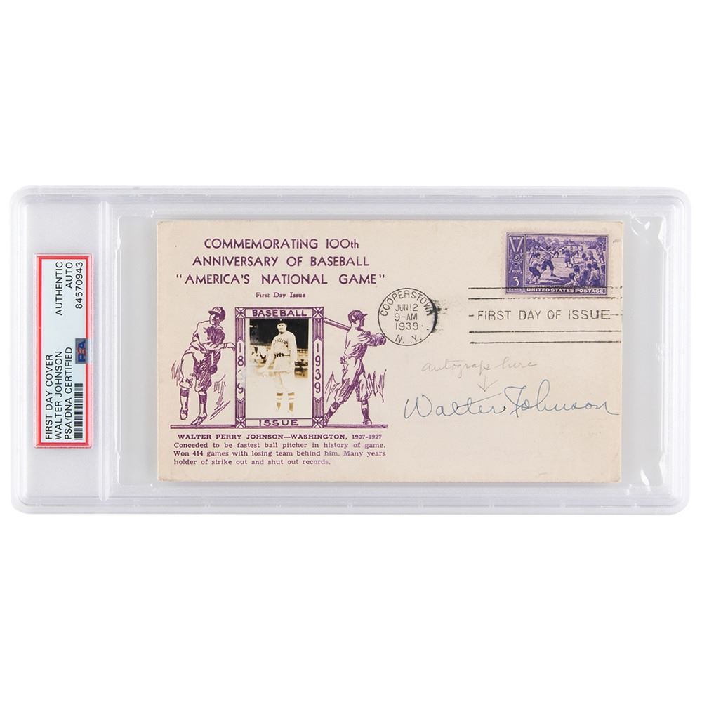 FDC with a cachet honoring the “100th Anniversary of Baseball†and Walter Perry Johnson, postmarked in Cooperstown, New York, on June 12, 1939, signed neatly in fountain pen, “Walter Johnson.†Designed and printed by W. G. Crosby, the cover boasts a 'real photo cachet' of Walter Johnson as manager of the Cleveland Indians. The three-cent postage stamp honoring baseball's 100th anniversary was issued in conjunction with the dedication and opening of the National Baseball Hall of Fame in Cooperstown, New York, on June 12, 1939. In fine condition. Encapsulated in a PSA/DNA authentication holder.