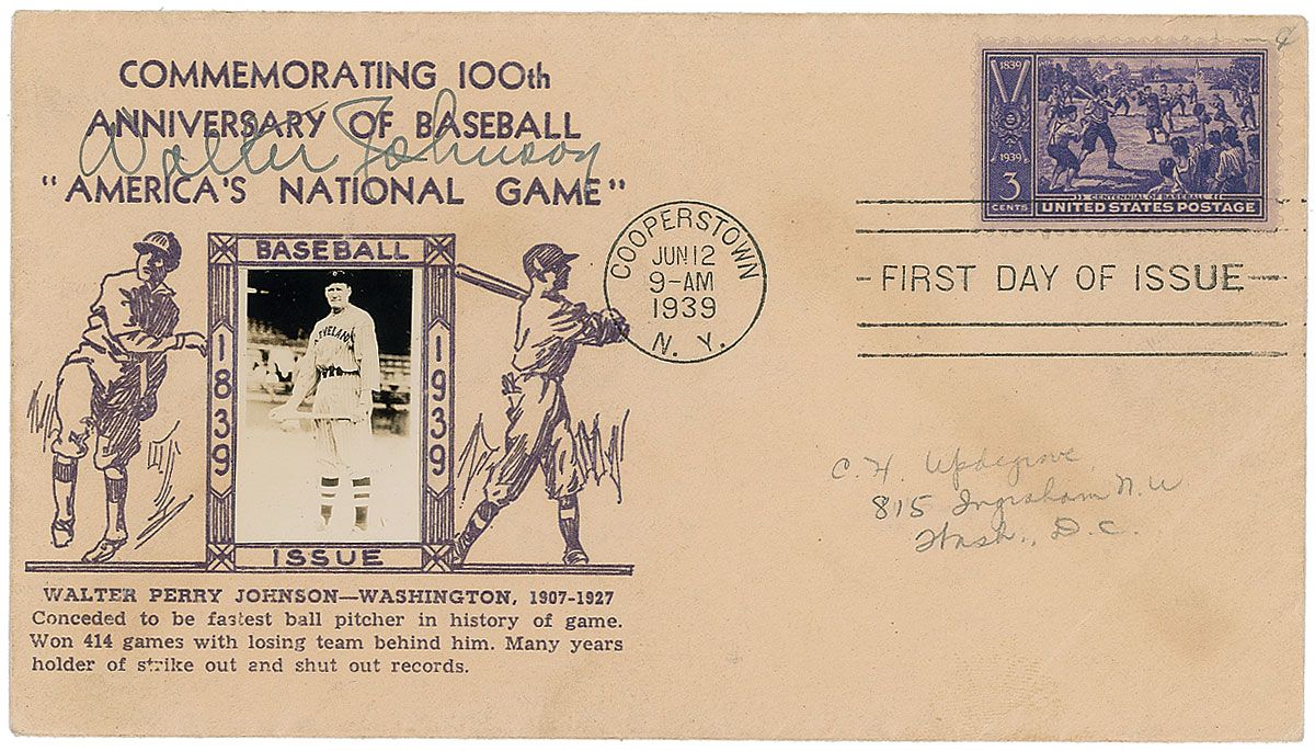 FDC with a cachet honoring the 100th anniversary of baseball, signed in the upper left in fountain pen. In very good condition, with uniform toning, a few scattered creases, and a pencil address in an unknown hand.