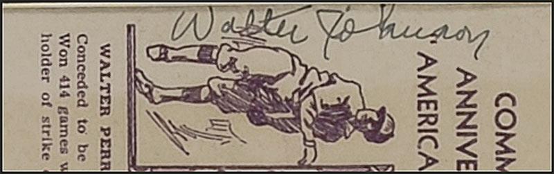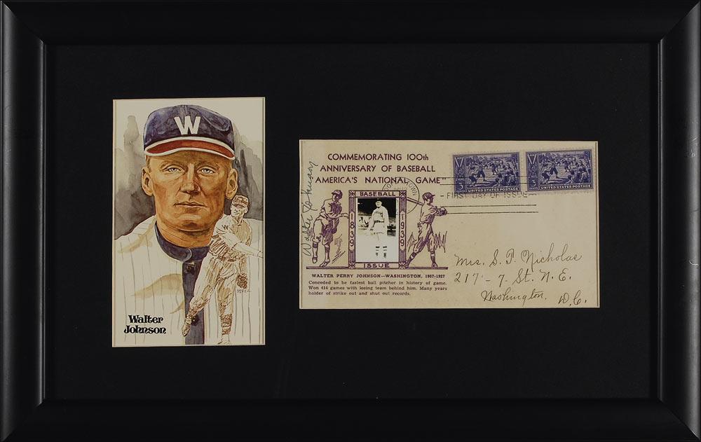 FDC with a cachet honoring the 100th anniversary of the baseball, signed vertically in black ink along the left edge by Johnson. Matted and framed with a Perez-Steele card, to an overall size of 15 x 9.5. In fine condition, with a light overall shade of toning, and an address in another hand to lower right. Pre-certified Steve Grad/PSA/DNA and RRAuction COA.