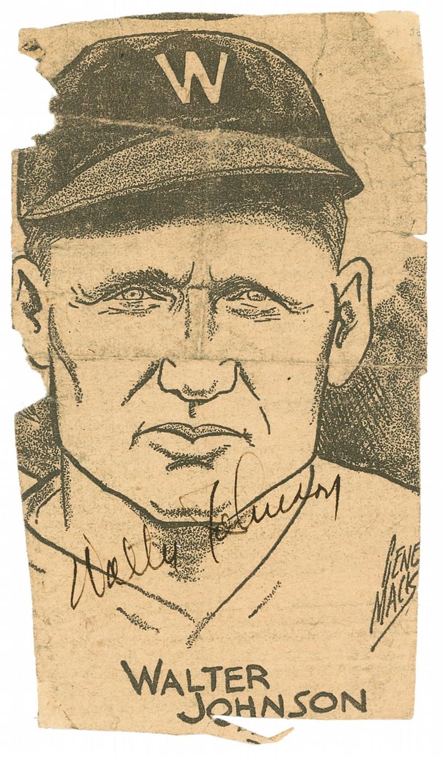 Johnson (1887–1946), whose famous deadly fastball earned him the nickname “Big Train,” was one of the first five original Hall of Fame inductees in 1936. In 1999, the Sporting News named him the fourth greatest player—the highest-ranked pitcher—of all time. Vintage 3 x 5 newspaper photo of a Gene Macks sketch of Johnson, signed in black ink. In very good condition, with irregular edges, several horizontal folds, scattered creases and wrinkles and some scattered edge loss.