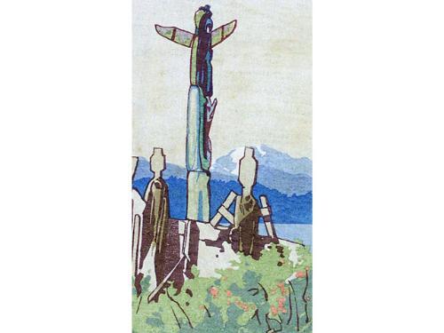 [Canadian ASA, CPE, CSPWC, MSA, RCA 1884-1963] TOTEMS, ALERT BAY; 1936 Colour woodcut on paper 6 x 3.25 ins. Signed & titled