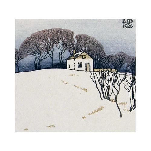 [Canadian ASA, CPE, CSPWC, MSA, RCA 1884-1963] LITTLE LOG HOUSE; 1926 Colour woodcut on paper 3.5 x 3.5 in. Signed.