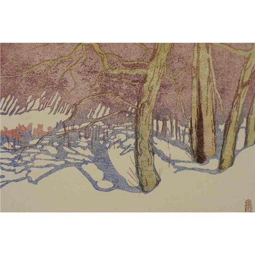 Canadian ASA, CPE, CSPWC, MSA, RCA [1884-1963] TREE SHADOWS ON SNOW; 1922 colour woodcut on paper 4 x 6 in (10.3 x 15.4 cm) signed; monogrammed & dated in the block Note: Produced as the Christmas greeting of 1922. Illustrated p. 198 "Walter J. Phillips: The Complete Graphic Works" (Boulet).