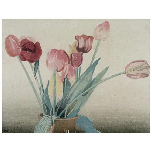 Canadian ASA, CPE, CSPWC, MSA, RCA [1884-1963] TULIPS; 1928 colour woodcut on paper; ed. #76/100 9.5 x 12.25 in. (23.8 x 31.4 cm) signed, titled & editioned; monogrammed in the block Note: Illustrated p. 308 "Walter J. Phillips: The Complete Graphic Works" (Boulet).