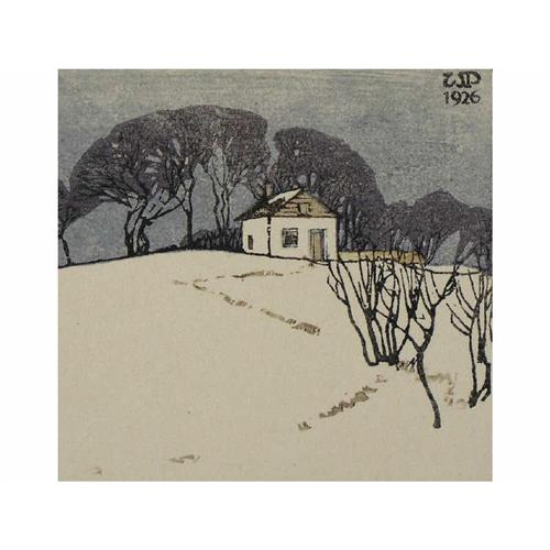 Canadian ASA, CPE, CSPWC, MSA, RCA [1884-1963] LITTLE LOG HOUSE; 1926 colour woodcut on paper 3.25 x 3.5 in. (8.5 x 9 cm) signed; monogrammed & dated in the block Note: Produced as a Christmas greeting of 1926. Includes the original printed card with a personal inscription. Illustrated p. 252 "Walter J. Phillips: The Complete Graphic Works" (Boulet) and p. 95 "The Tranquility and the Turbulence" (Boulet).