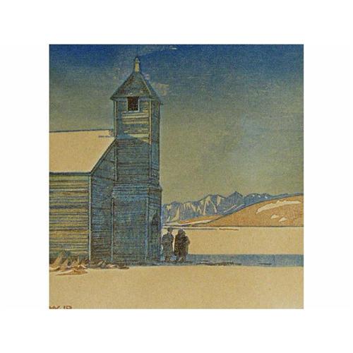 Canadian ASA, CSPWC, CSGA, MSA, RCA [1884-1963] CHURCH AT MORLEY, AB; 1942 colour woodcut on paper 3.75 x 3.5 in. (9.3 x 8.9 cm) signed; monogrammed in the block