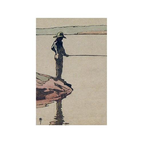 Canadian ASA, CPE, CSPWC, MSA, RCA [1884-1963] THE ANGLER; 1926 colour woodcut on paper 4.5 x 3 (11.4 x 7.6 cm) signed; monogrammed in the block Note: Illustrated p. 93 "The Tranquility and the Turbulence" (Boulet). In Phillips' book entitled "The Technique of the Colour Woodcut" (1926) this particular print was used by Phillips to illustrate the method.