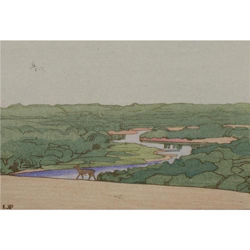 Canadian ASA, CPE, CSPWC, MSA, RCA [1884-1963] ASSINIBOINE RIVER FROM BIG SPRINGS, MANITOBA LANDSCAPE; 1929 colour woodcut on paper 3.25 x 4.75 in. (8.2 x 11.9 cm) signed & titled; monogrammed in the block Note: Produced as the Christmas greeting of 1929. Includes the original printed card. Illustrated p. 320 "Walter J. Phillips: The Complete Graphic Works" (Boulet) and p. 112 "The Tranquility and the Turbulence" (Boulet).