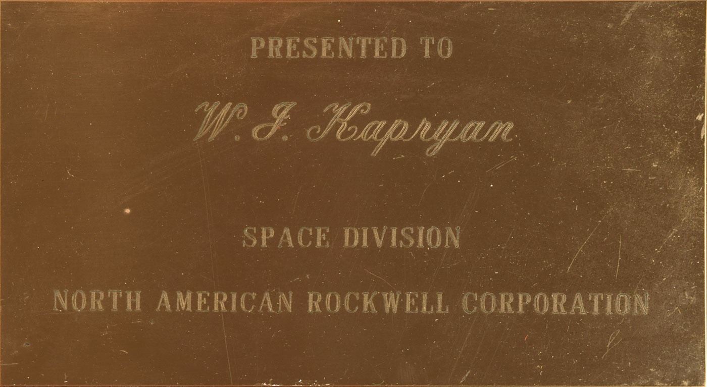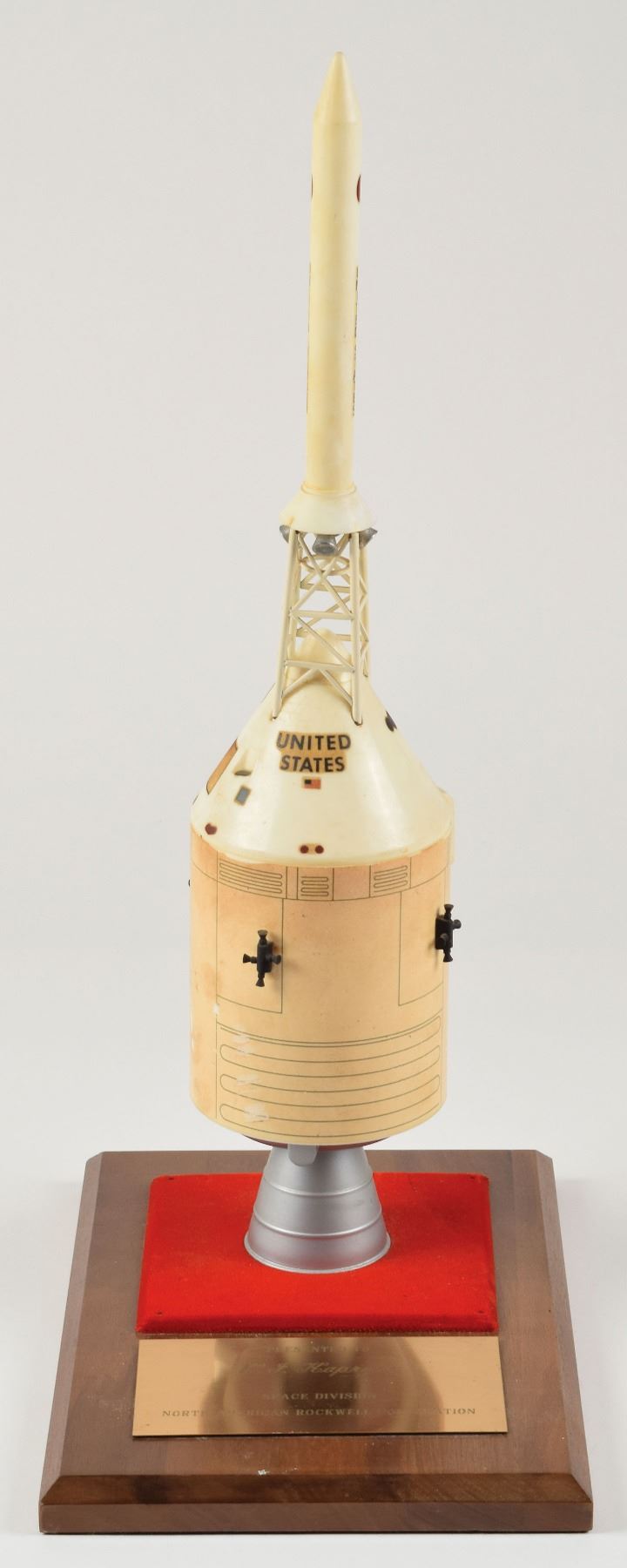 Vintage model of an Apollo capsule with Launch Escape System by the North American Rockwell Corporation, standing 19.25? tall and set upon an 8 x 12 x .5 wooden base with engraved presentation plaque: "Presented to W. J. Kapryan, Space Division, North American Rockwell Corporation." In very good to fine condition, with some wear and soiling to the capsule; and adhesive remnants near previously mended connection point.