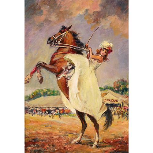 Walter Krawiec (American, b. 1889), "Equine Performance", c. 1935; oil/board, 20" x 14", signed. Chicago painter, cartoonist, and illustrator.