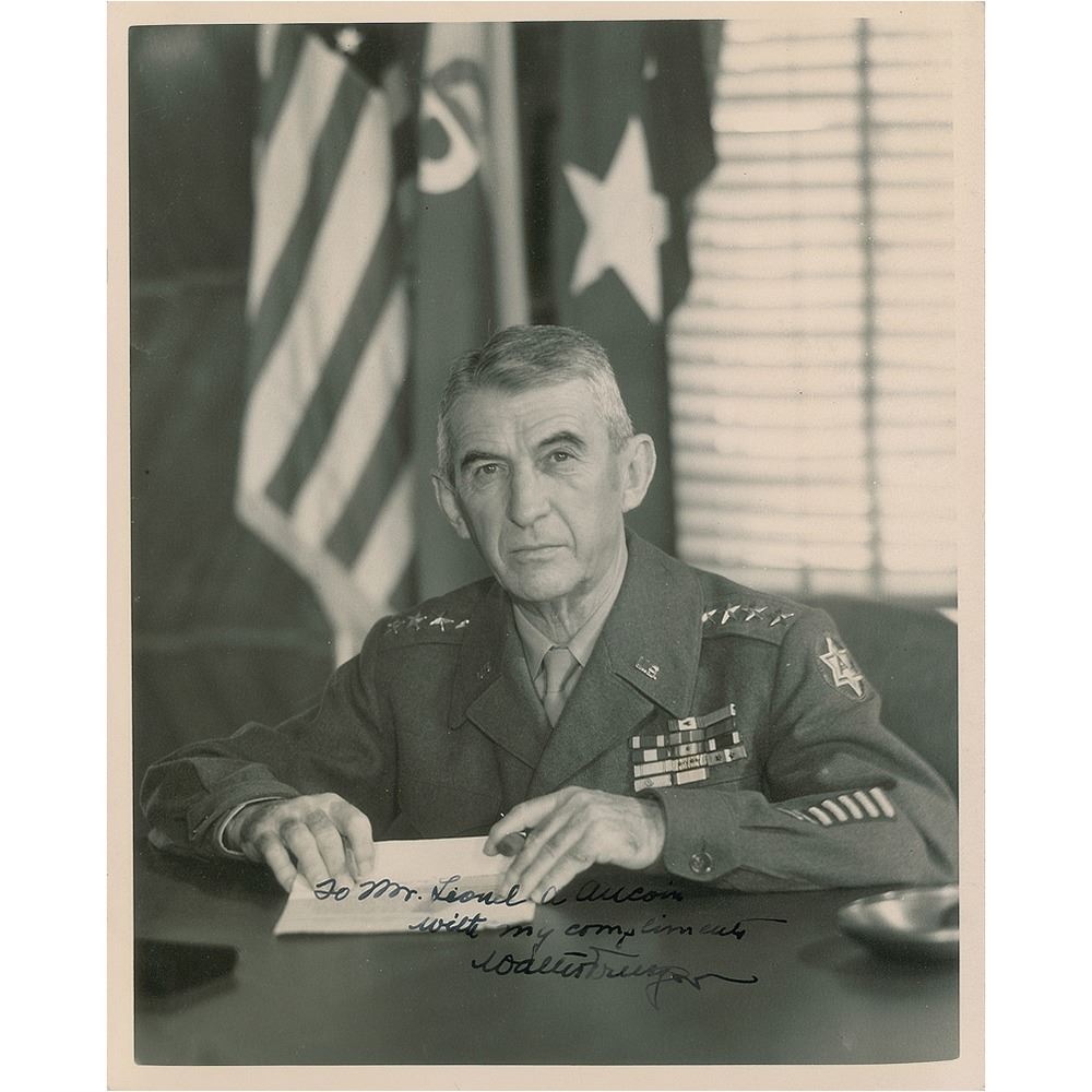 Vintage matte-finish 8 x 10 photo of Gen. Krueger in uniform, signed and inscribed in fountain pen, "To Mr. Lionel Aucoin, with my compliments, Walter Krueger.” In very fine condition.